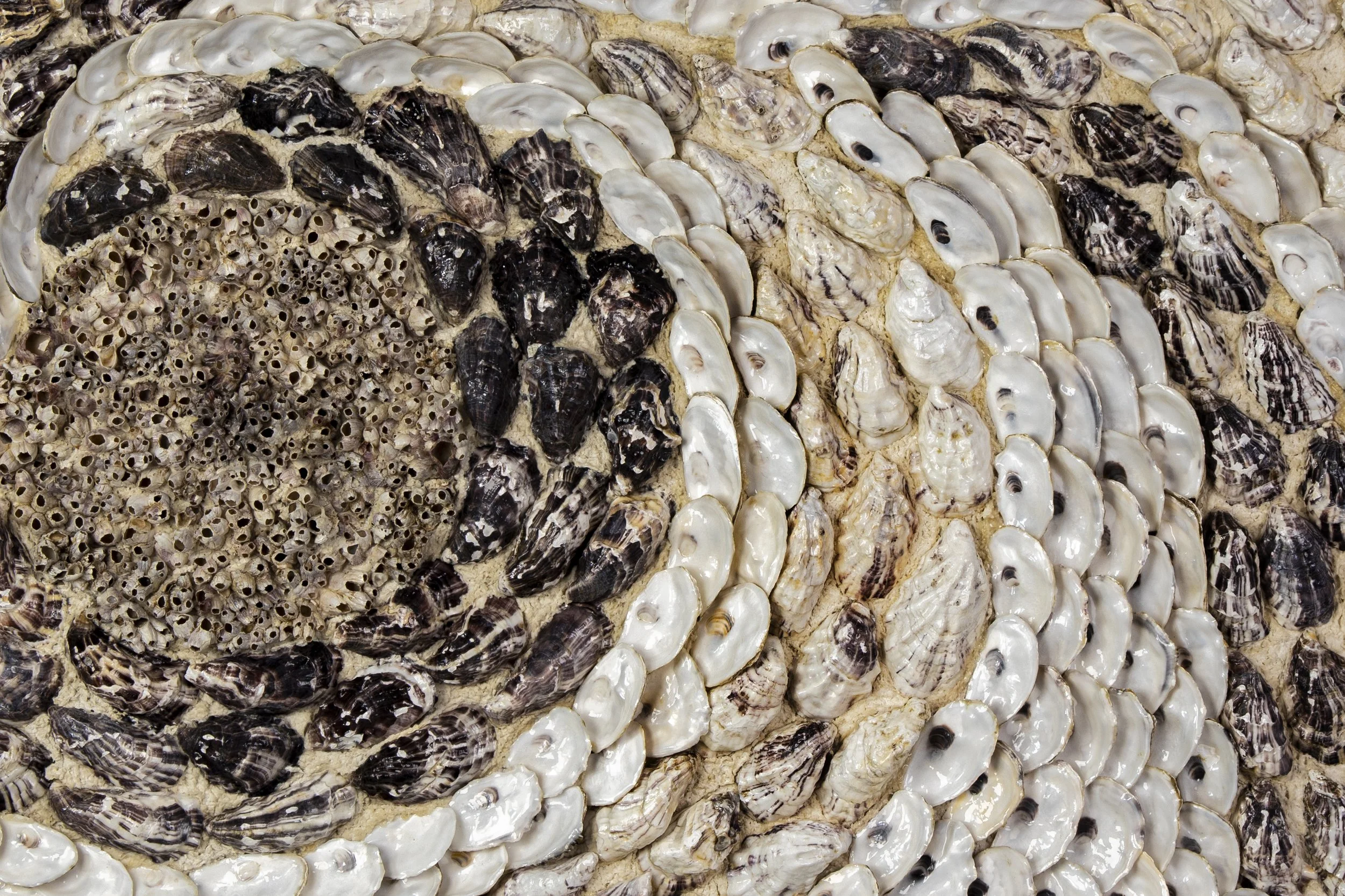 Detail, white Oyster shells, Barnacles and Gold leaf on canvas - Floral design (SOLD)