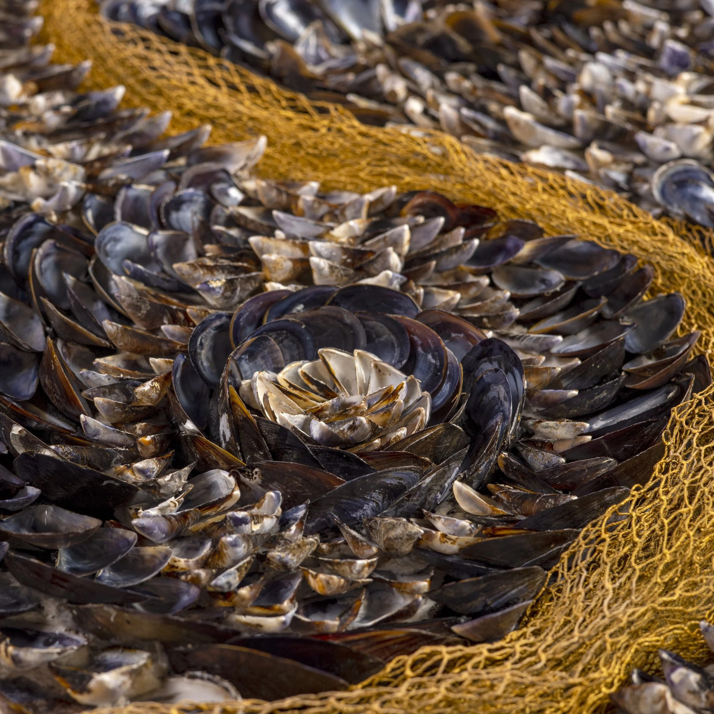 Close up, Mussel shells on canvas - Coastal chic, shell one-off design. ( Available in studio.Please,contact me at dana@danashellart.com )