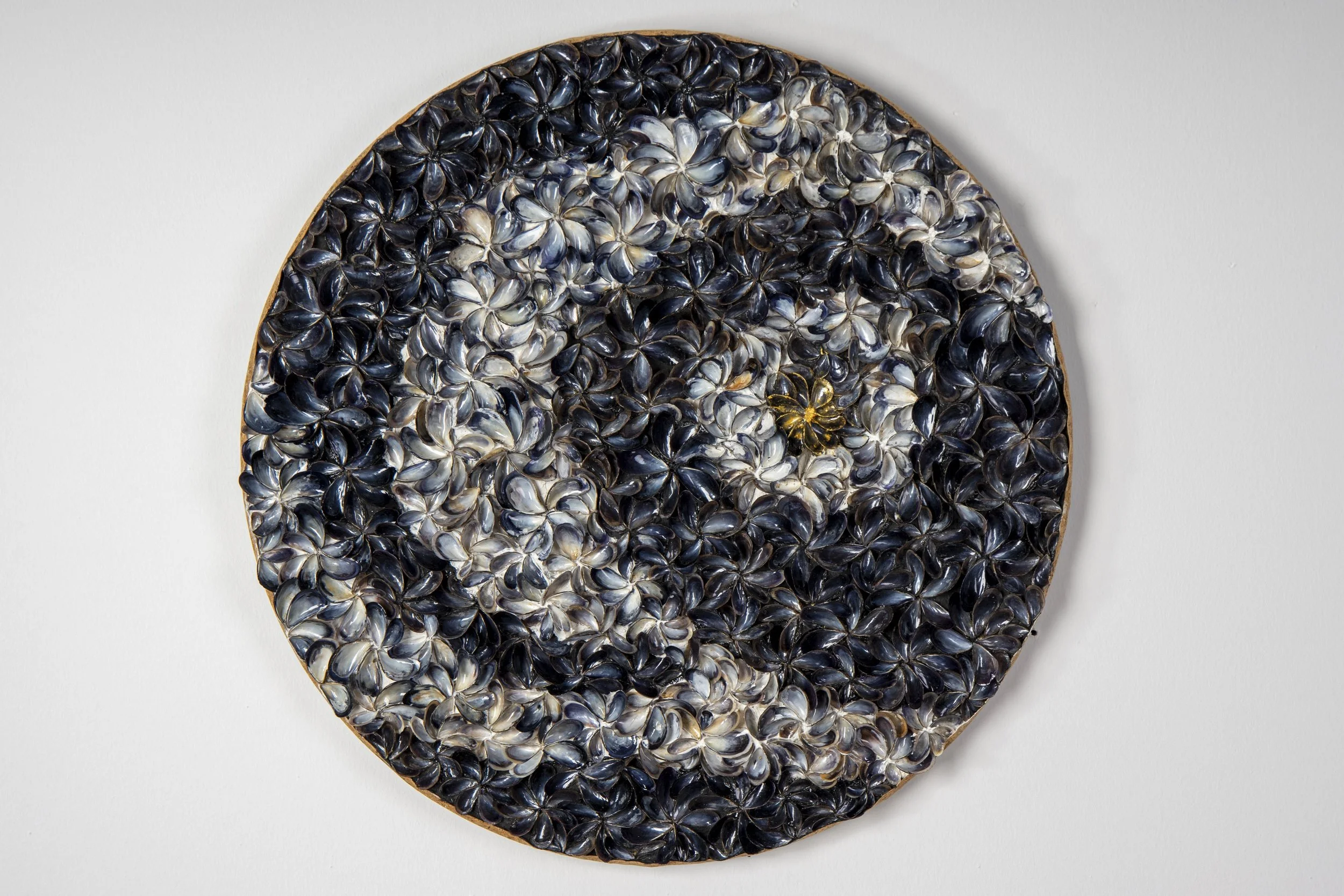 SUNRISE, Mussel Shells on canvas, ⌀ 50cm- Sustainable Shell Wall Art. ( Available in studio.Please,contact me at dana@danashellart.com )